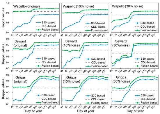 As reported in previous studies, the CDL data provided by USDA have a relatively high overall accuracy (85–95%) [35]. However, such CDL data were not released in many other countries of the world, implying that the historical planting data must be produced by individual users when applying the fusion method. Classification errors may be higher in these produced data. Therefore, we need to explore whether and to what extent the classification error of historical CDL data affects the performance of CDL-based, spectral-based, and fusion-based classifications. For this objective, we performed a simulation experiment by simulating classification errors in the historical CDL data at the three U.S. sites. To simulate different levels of classification errors, 10% (or 30%) pixels in the historical CDL dataset of each year were randomly labeled as the other crop types. For example, corn pixels in Wapello in a given year were mislabeled as soybean or other crops. The experimental results show that the CDL-based classification accuracy obviously decreased under the scenarios with simulated classification errors, whereas classification errors had less of an effect on the performance of spectral-based classification (Figure 11). In Wapello, the CDL-based Kappa values decreased from 0.83 to 0.80 (10% random error) and 0.74 (30% random error) and in Seward, the values decreased from 0.63 to 0.61 (10% random error) and 0.56 (30% random error). The decreases are smaller in Griggs due to the low CDL-based classification accuracy. The performance of fusion-based classification was also affected by simulated classification error, especially in the early periods. The soft classification probabilities of the CLD-based and spectral-based results are combined using the weights trained by the MLP module; thus, improper weights may be obtained using the training dataset with incorrect crop type labels, which accounts for the decreases in the fusion-based performance. This experiment highlights the necessity of high-quality historical crop planting data for pre- and within-season crop identification.