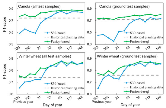 We used the proposed fusion method to identify canola and winter wheat at the Sichuan site. Among the test samples in the year 2021, some were collected from ground investigations (354 samples) and others were collected from the visual interpretation of high-resolution images on Google Earth (385 samples). The results show that the change patterns of the CDL-based, spectral-based, and fusion-based accuracies at this site are similar to those observed at the three U.S. sites (Figure 12). The spectral-based F1 scores first increased as the growing season progressed and then exceeded the fixed CDL-based values. The fusion-based estimate incorporates the strengths of the CDL-based and spectral-based estimates and generated higher F1 scores throughout the growing season. Interestingly, we observed obvious differences for canola identification when using different test datasets for the evaluations (upper panels in Figure 12). The spectral-based F1 scores for canola based only on ground test samples are much smaller than the values evaluated with all test samples (0.73 vs. 0.84 at the end of the season), whereas the CDL-based F1 scores did not exhibit such differences between the two test datasets. These observations imply that there are obvious variations in canola identification accuracy across space, which may be attributed to the occurrence of cloud contamination during the flowering periods of canola at some locations. To verify this speculation, we calculated the Sentinel-2 image cloud coverage at the locations of the ground samples and visual interpretation samples. As we expected, there was an obviously higher cloud coverage for the locations of the ground samples during the important flowering periods (the range of the black dashed line in Figure S2), thus greatly decreasing the canola identification accuracy at these locations. For more accurate evaluations, it is necessary to collect more test samples under various conditions (e.g., variations in cloud coverage, crop phenology, and crop variety), although sample collection is time-consuming and labor-intensive.
