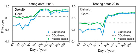 The performance of CDL-based, S30-based, and fusion-based classifications for corn in the Dekalb County (located in Illinois) using the years 2018 and 2019 as the testing data.