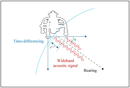 As for the USBL positioning principle, it is typically divided into two categories. For single-frequency narrowband signals, USBL generally locates the target by measuring the phase difference of arrival (PDOA) of different array elements when receiving feedback from the target, while for more widely used broadband signals, USBL adopts time difference of arrival (TDOA) between different array elements to position the underwater target. Without loss of generality, the positioning principle based on TDOA will be depicted as shown in Figure 2. According to the planar approximation of acoustic waves, as in the classical approach presented in reference [37], the direction and the distance between the transponder and the acoustic array are available to compute the relative positions expressed in the ship body frame.