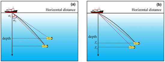 Combined with the acoustic timing measurements and the known real-time positions of the transmitter, the direction angle provided by the USBL system can be used to track acoustic rays on principle, which is defined as one kind of ray tracing direct problem [18]. However, the departure angle of the ray with respect to the vertical plane is referred to as the incident angle, which does not entirely reflect the true direction () of the target as the result of the curved propagation trajectory, as shown in Figure 3. Actually, this angle bias will cause the traced location deviation of the target. In addition to the bearing, as an important data source, depth measurements obtained by the equipped pressure sensor, typically with the superior accuracy of 0.01% range [40], are applied to solve the direct problem, which can be depicted by