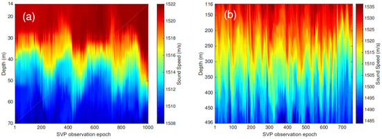 A ray-tracing strategy based on the fixed SVP shows superiority in positioning performance when compared with the referenced SVV commonly adopted in ocean engineering. However, in shallow water, ARVs tend to conduct missions for dozens of hours; meanwhile, the SVP presents temporal variation features due to the changing temperature and depth, as shown in Figure 4, modified after reference [43]. The left subfigure is generated based on the SVP data recorded every 15 s, over a 48 h period, from 14 m to 70 m depth, with 4 m spacing, while the right subfigure is plotted according to CTD data collected at about 1 m resolution from 116 m to 496 m. The fixed SVP could not contain the temporal variation information of SSS; thus, the aforementioned ray-tracing method lacks the potential to correct the time-varying effect of SVP and limit the real-time positioning ability of USBL toward the targets in shallow water.