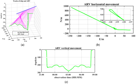 Sketch map of the ARV and support ship trajectories. (a) A 3D view of surveying tracks, magenta lines stand for the relative positions between the sea-surface ship and the towed ARV; (b) horizontal movement tracks of ARV; the subfigure in the upper right corner shows the turning session; and (c) vertical movement time series of the ARV at the “fixed height mode.”