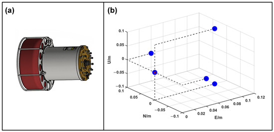 (a) External view of the portable USBL; (b) layout sketch map of receivers in the USBL array. Blue dots denote for the elements of the acoustic array, and the red point shows the array’s center.