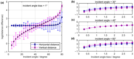 The common logarithm of the distance difference between the traced and geometric values is evaluated under the initial condition of the incident angle. Specifically, (a) illustrates the distance difference with respect to variable incident angles, assuming a 1° angle bias. Additionally, (b–d) presents the distance difference based on the variable incident angle biases corresponding to incident angles of 30°, 45°, and 60°, respectively.