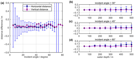 The distance difference between the traced and the geometrical values is evaluated under the initial condition of the depth observations. Specifically, (a) illustrates the distance difference regarding variable incident angles at the water depth of 500 m. Additionally, (b–d) shows the distance difference based on variable depth with respect to incident angles 30°, 45° and 60°, respectively.