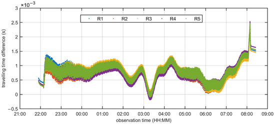 The aforementioned correction method relies on a fixed SVP. However, the time taken for acoustic signals to travel from a specific source to a static target varies due to the temporal fluctuations in the SSS. By incorporating time-varying SVPs, as depicted in Figure 7, and considering the receiver’s installation geometry, as shown in Figure 8b, we obtain more reliable travel time observations based on matched SVPs. Figure 11 illustrates the differences between timing observations based on time-variant SVPs and those based on fixed SVPs, revealing variances on the order of a few milliseconds. This discrepancy is generally larger than the USBL timing accuracy and can lead to systematic ranging errors, thus compromising the USBL positioning performance if the temporal variation of SSS is not considered. Given the limited array space and the assembly of five receivers, the time differences corresponding to these receivers exhibit similar changing trends.