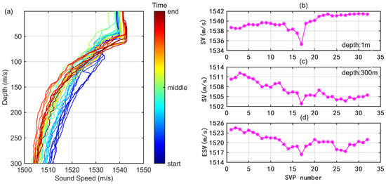 The sketch map of the SVP time series and the selected SVs. Specifically, (a) a series of collected SVPs; the color bar shows the observation time sequence involving the start, the middle, and the end. (b) Observed SVs corresponding to the epoch of the SVP series at a depth of 1 m. (c) Observed SVs corresponding to the epoch of the SVP series at a depth of 300 m. (d) ESV of each SVP corresponding to the full depth.