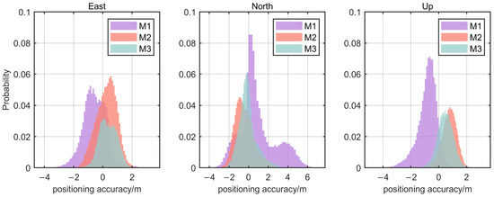 Positioning errors in the east, north, and up directions are shown in Figure 15. The constant sound speed approach introduces systematic ranging errors due to the disparity between the geometric distance and the curved acoustic path. The positioning errors with the M1 method are represented by the purple histogram and display a multimodal distribution, especially in the north direction. The multimodal phenomenon is partially alleviated by applying the ray-tracing method, which accounts for acoustic ray bending errors, resulting in improved positioning performance. Furthermore, the proposed two-step sound speed correction method shows even better results. Intuitively, the frequency histogram’s mode with the M3 method is smaller than that observed with either the M1 or M2 methods, indicating more accurate and consistent positioning outcomes.