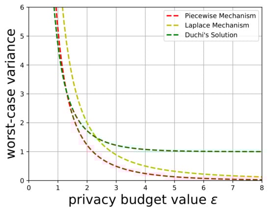 Different from the Laplace mechanism [] and Duchi et al.’s method [] for one-dimensional data, PM will adjust the probability destiny function according to the input value, which leads to a lower worst-case variance compared to Duchi et al.’s and Laplace mechanism’s . It is easy to prove that the PM has a lower variance than Duchi et al.’s method when . Additionally, the worst-case variance of the Laplace mechanism and PM will decrease dramatically as increases. However, PM’s worst-case variance is still lower than that of the Laplace mechanism, as illustrated in Figure 1.