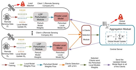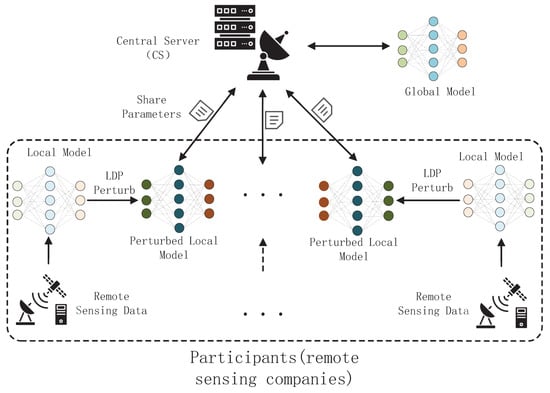 (2) Participants are remote sensing companies involved in federated learning. These companies collect remote sensing image data via private satellites and intend to train a more efficient global model collaboratively. At the beginning of FL, participants initialize their local model based on the parameters distributed by the CS (i.e., global model parameters). Then, the participants start to perform local training using their private remote sensing dataset. Then, participants perturb their local model’s parameters through the LDP algorithm, upload the perturbation parameters to CS, and wait for the next iteration.