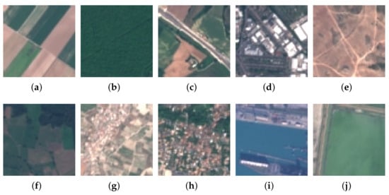 EuroSAT was proposed by Helber et al. [], which is a satellite image dataset based on Sentinel-2. EuroSAT provides 27,000 non-overlapping color pixels images and is classified into ten categories, as shown in Figure 4. Researchers often use it as a benchmark dataset for land use and land cover issues in remote sensing image recognition.