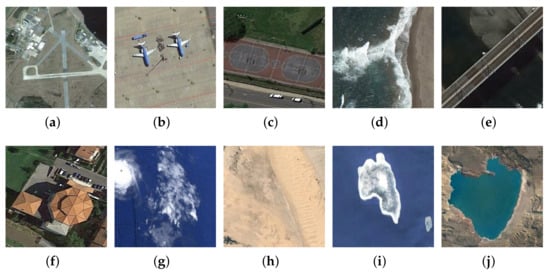 NWPU-RESISC45 [] was created by Northwestern Polytechnical University (NWPU) as a benchmark dataset for remote sensing image scene classification. It consists of 31,500 remote sensing images that cover 45 scene categories, with 700 images in each category. Due to its large-scale scene categories and data quantity, it is widely used in remote sensing image classification tasks. In Figure 5, we present part of the scene images of NWPU-RESISC45.