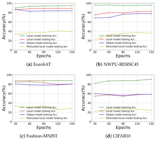 Why does LDP-Fed work? In Figure 6, we recorded the performance of the local and global models on four datasets during LDP-Fed’s training process. Specifically, we recorded the updated local models’ training and testing accuracy, the testing accuracy of the local models after LDP perturbation, and the testing accuracy of the aggregated global models at 30, 60, 90, 120, and 150 epochs, respectively. The experimental results showed that the local and global models converge after 30 epochs, and the perturbation effect of LDP on the local models is evident. It seriously reduced the testing accuracy of the local models by around 40–50 percentage points for all datasets, while the aggregated global model still performs well after aggregation. LDP perturbation caused dramatic changes in the local models’ parameters, leading to significant inaccuracies in a global attacker’s training dataset. That is why the LDP-Fed is so effective in defending against attacks launched from the global side. The global model received by the client still maintained a good performance, resulting in LDP-Fed being less effective than the global attacker in defending against the local attackers.