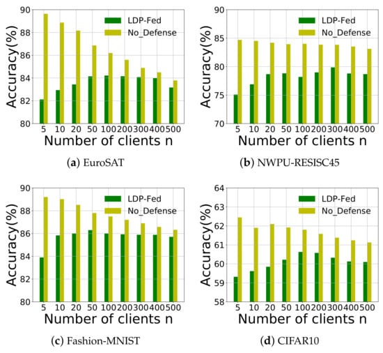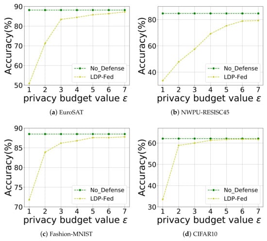 Another important hyperparameter to the LDP-Fed is the privacy budget . As shown in Figure 8, we analyzed the effect of on model performance. Specifically, we set n to 20 in FL and presented the accuracy results with from 1 to 7 for all four datasets. It showed that the accuracy would increase as increases. We observed four different as an inflection point on EuroSAT , Fashion-MNIST , CIFAR10 , and NWPU-RESISC45 . The model’s accuracy dropped rapidly when was less than the point. On the contrary, the accuracy increased slowly and was close to the undefended model’s performance. Furthermore, more complex datasets or DNN models require more privacy costs. This is because of the more sophisticated neural network and more model weights.