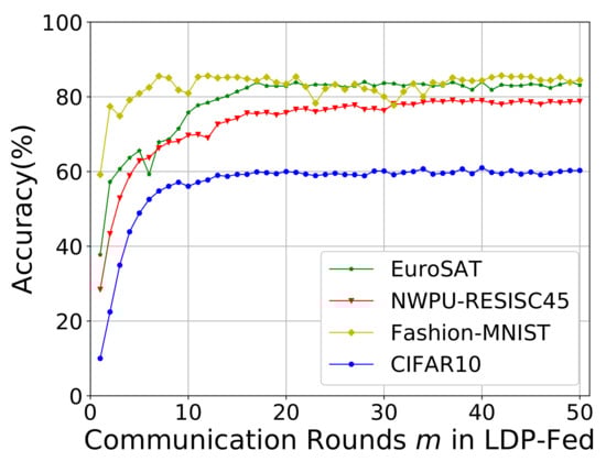 Comparison with other LDP-FL. In Figure 8, we set for all the datasets. Our LDP-Fed achieved 73.4% accuracy with , 77.9% accuracy with , 83.8% accuracy with , and 59.3% accuracy with on EuroSAT, NWPU-RESISC45, Fashion-MNIST, and CIFAR10, respectively. To our knowledge, the results are very competitive with previous works. Geyer et al. [] first applied DP under Gaussian Mechanism to federated learning to preserve clients’ level privacy. While they only achieved 78%,92%, and 96% accuracy with on MNIST with differential privacy, where represented the privacy budget, communication rounds, and clients number, respectively. LDP was first exploited for federated learning by Bhowmick et al. []. However, due to the high variance of their LDP algorithm, to improve the convolutional neural network model’s accuracy to 10 percent of the original value, they required a relatively large privacy budget and communication rounds, i.e., CIFAR10 . Truex et al. [] utilized condensed local differential privacy (CLDP) to FL and up to for Fashion-MNIST. Unlike the DP privacy budget , -CLDP’s privacy budget is controlled by the parameter . However, -CLDP achieved the accuracy by requiring a high privacy budget (e.g., ), which may cause a weak LDP guarantee. Meanwhile, they did not apply -CLDP to a more complex DNN model or dataset. Sun et al. [] proposed an advanced LDP-Fed recently, which obtained high accuracy while protecting the privacy of the model, i.e., Fashion-MNIST , CIFAR10 . However, they need more than 100 clients in FL because they added the same noise to all parameters. Thus, the number of clients must be constantly increased to reduce the noise’s impact on model performance. In our LDP-Fed, we designed a special noise addition method against MIAs. We can efficiently train excellent complex DNN models with fewer clients than in previous works.