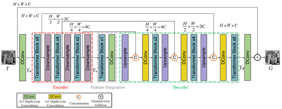 - Encoder: It first obtains the low-level shallow features of the noisy image Y through a deep convolutional layer with a kernel size of . Then, it acquires the high-level features from through an encoder. The encoder consists of three transformer layers and three down-sampling operations to capture the context in the image Y. The first layer of the encoder consists of eight transformer blocks, with the number of subsequent transformer blocks decreasing by half per layer. The spatial size of the feature map in each encoder layer is reduced half layer by layer through the down-sampling operation, while its channel capacity is doubled accordingly.