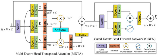 Figure 2 illustrates the structure of each transformer block, which is the same as that in Restormer [25]. Generally, a transformer block comprises a Multi-Dconv head Transposed Attention (MDTA) module and a Gated-Dconv Feed-Forward Network (GDFN) module. The MDTA module first generates query (Q), key (K), and value (V) projections enriched by the local context. Next, it reshapes the query and key projections so that their dot–product interaction generates a transposed-attention map A of size instead of a huge regular attention map of size . Therefore, compared with the original transformer model, it has a higher processing efficiency for high-resolution images. The GDFN module uses a gating mechanism to improve representation learning. The gating mechanism is formulated as the element-wise product of two parallel paths of linear transformation layers, one of which is activated with the GELU non-linearity function [26]. It controls the information flow through the respective hierarchical levels in the pipeline, thereby allowing each level to focus on the fine details complementary to the other levels.