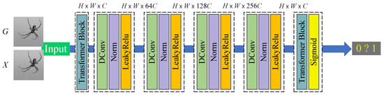 For a generated despeckled image and a clean image X, the goal of the discriminator network in SID-TGAN is to distinguish from X. The architecture of the discriminator network adopts that of the Markov discriminator [27] as shown in Figure 3. The discriminator consists of four deep convolutional layers and two transformer layers. The input images first pass through a transformer layer for shallow global feature extraction. Then, deep local features are obtained through four deep convolutional layers. Furthermore, a transformer layer further fuses the multi-scale feature maps. A sigmoid activation function obtains the final discrimination result. After a deep convolution operation in each convolutional layer, a layer normalization operation [28] is adopted to prevent overfitting, and a non-linear activation function LeakyRelu [29] is used to avoid the sawtooth path of gradient updates, which retains the negative gradient information so that it will not be lost entirely.