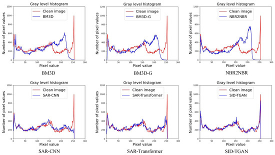 From Table 2, we observe that SID-TGAN achieves the best despeckling performance in all metrics on optical images. SID-TGAN improves on the existing methods in terms of PSNR, SSIM, and GHC by at least 0.326, 0.020, and 0.013, and at most 6.788, 0.196, and 0.244. SAR-Transformer and SID-TGAN outperform the other four baselines in the PSNR metric, indicating that transformer blocks better capture the global dependencies between different image regions, mitigate the shortcomings of CNNs, and improve the despeckling performance. Unlike SAR-Transformer, SID-TGAN adopts the architecture of GAN and the adversarial loss to generate higher-quality images. Both SID-TGAN and SAR-CNN use discriminative model learning for image despeckling. They achieve the best and second-best GHC values, indicating that the discriminative model drives the local texture and style toward consistency in an adversarial fashion. In addition, we also provide a comparison of the coincidence of the grayscale histogram between the despeckled image returned by each method and the clean image in Figure 4. We can see that the grayscale histogram of the despeckled image returned by SID-TGAN highly overlaps with the grayscale histogram of the clean image. The despeckling performance of SID-TGAN significantly outperforms all other baselines in all evaluation metrics.