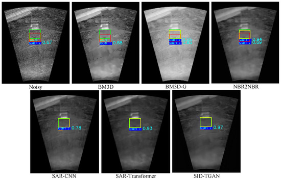 Accuracy for Target Detection on Despeckled Sonar Images. We compare the accuracy of target detection using Faster-RCNN [33] on noisy and despeckled sonar images to evaluate the improvements of different despeckling methods in image quality. The results for target detection on the sonar-detection dataset are shown in Table 6. Undoubtedly, despeckled sonar images provided by SID-TGAN and SAR-Transformer [24] exhibit superior image quality. Compared to noisy sonar images, despeckled sonar images provided by SID-TGAN show a remarkable improvement in all three accuracy metrics for target detection, i.e., mAP, mAP@50, and mAP@75 by 4.5%, 1.7%, and 8.4%, respectively. It is surprising that the mAP, mAP@50, and mAP@75 of the despeckled sonar images returned by NBR2NBR [13] and SAR-CNN [10] are even lower than those of noisy sonar images. This implies that NBR2NBR [13] and SAR-CNN [10] fail to effectively remove the speckle noise in the sonar images. After despeckling sonar images with two filtering-based methods, namely BM3D [4] and BM3D-G [18], the mAP, mAP@50, and mAP@75 metrics show marginal improvements but are still inferior to transformer-based despeckling methods, i.e., SID-TGAN and SAR-Transformer [24]. We also visualize the effects of using despeckled images by different methods for the target detection task in Figure 7. The above results confirm that SID-TGAN achieves better despeckling performance and provides sonar images of higher quality for target detection compared to existing despeckling methods.