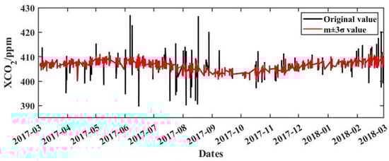 In our study, we employed a 3-sigma method to screen the TCCON data. Specifically, we selected data within the time range from March 2017 to February 2018 (to match the XGOT data) and calculated the differences between adjacent observations. We obtained the average value (m) and standard deviation (σ) of these differences. Observations with differences that fell outside the range of m ± 3σ (forward and backward simultaneously) were considered outliers and were subsequently removed. To illustrate this process, we use the Burgos (bu) site as an example to demonstrate the contrast before and after the removal of abnormal values (Figure 2). The m ± σ changes from 406.629 ± 1.581 ppm to 406.632 ± 1.526 ppm after the removal of outliers, with the total number of observations going from 36,163 to 36,043 (0.3% of the data was excluded).