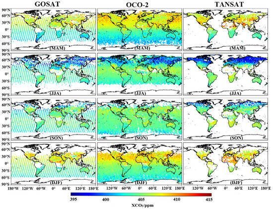 Scatter plot of the original XCO2 data from the three satellites from March 2017 to February 2018. MAM: March, April, May; JJA: June, July, August; SON: September, October, November; DJF: December, January, February.