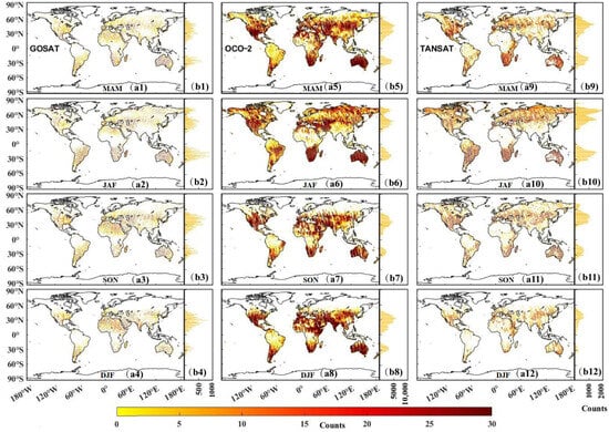 Figure 4a1–a12 displays the spatial distribution of point counts within each 1° × 1° grid for the three satellites in four periods. Figure 4b1–b12 shows the total counts of XCO2 points in each latitude band. It is important to note that, due to the extensive volume of data from OCO-2, we applied a logarithmic transformation with a base of 100 to map the spatial distribution of scatter counts.