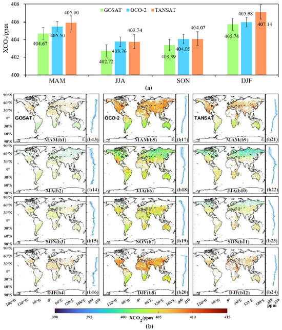 Figure 5 compares the XGOT from seasonal, spatial, and latitudinal aspects. We initially evaluated the XGOT data in four periods. Figure 5a illustrates that XGOT exhibits a consistent seasonal variation pattern across all four periods. Specifically, XGOT has the lowest values in JJA (402.72 ppm, 403.76 ppm, and 403.74 ppm for GOT, respectively), followed by SON (403.39 ppm, 4.4.05 ppm, and 404.07 ppm), with the highest values occurring in DJF (405.74 ppm, 405.98 ppm, and 407.14 ppm). Furthermore, the XCO2 values of TANSAT are consistently higher than those of OCO-2 throughout all periods, while GOSAT consistently exhibits the lowest values. Moreover, the standard error of TANSAT is the largest, while OCO-2 has the smallest standard error, reflecting the relative consistency of the XCO2 data to some extent.