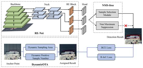 The overall framework of our method is illustrated in Figure 2. The network directly predicts the objects’ center points (including x and y coordinates), width, height, IoU, and rotation angle. We propose several techniques to improve YOLOX for fast and accurate oriented object detection, including the RE-Net and the DynamicOTA. Additionally, we add the SSM that enables full end-to-end object detection, eliminating the need for NMS. The following sections provide detailed descriptions of these modules.