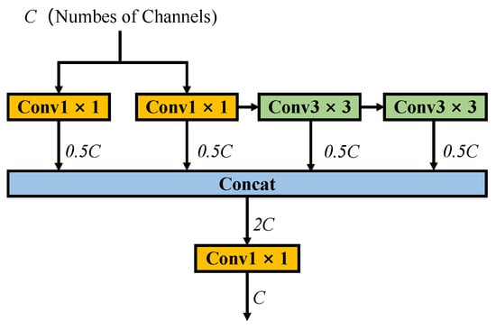 RepVGG [] improves the accuracy of the model without increasing the inference time by equivalently converting parallel 1 × 1 and 3 × 3 convolutions and identity connections into 3 × 3 convolutions. This method, called structural re-parameterization, streamlines the model structure and reduces the computational load. Linear over-parameterization [] converts the cascaded 1 × 1 and 3 × 3 convolutions into equivalent 3 × 3 convolutions and shows excellent performance.