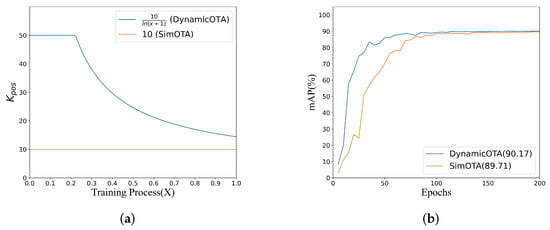 where x represents the training progress, with a value range between . The number of positive samples assigned to each GT is the sum of the top IoU values (IoU calculated between the detection boxes and GT boxes). The maximum value of is 50. Figure 10a shows the function curve, where is set to 10 in SimOTA, while our method dynamically adjusts .