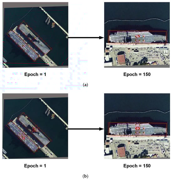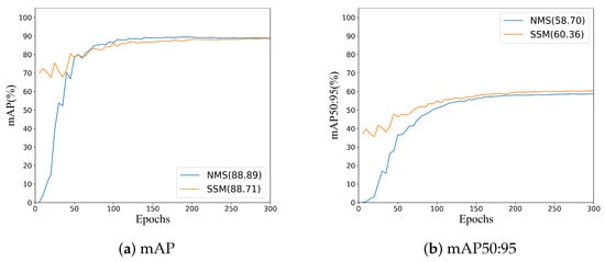 Figure 10b provides an experimental validation of DynamicOTA on the HRSC2016 dataset [] by comparing it with the original SimOTA. It shows that our method can significantly improve the convergence speed and the final accuracy of the detector.