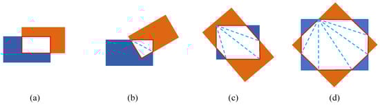 The NMS algorithm needs to calculate the IoU between different detection boxes to eliminate redundant detections. For HBB detection, the calculation of the IoU is relatively simple. However, for OBB detection, the calculation of rotated IoU is complex, requiring consideration of various cases as shown in Figure 12. In addition, post-processing with NMS adds an extra algorithm module that prevents the network from being fully end-to-end. In comparison, the NMS-free method enables end-to-end detection and achieves comparable performance, facilitating network deployment on embedded devices.