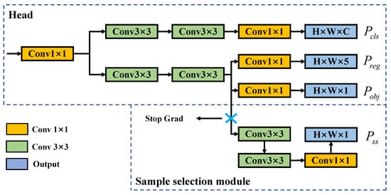 Label assignment is a critical issue in object detection, which directly affects the detector’s performance. Current label assignment strategies typically use preset matching rules or thresholds to determine positive and negative samples, but these methods do not consider the impact of the training process. SimOTA [], the label assignment strategy used by YOLOX, is faster than OTA [] and does not require additional hyperparameters. SimOTA determines the number of positive samples according to detection quality. It assigns positive samples to each ground truth (GT), where is calculated from the sum of the top 10 IoU values between predicted bounding boxes and GT.