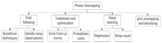 Phase unwrapping in higher dimensions can be performed by dividing the problem into lower dimensions. Based on the number of phase images used, phase unwrapping can be divided into single-baseline (SB) and multi-baseline (MB) methods. SBPU methods use a single interferogram for unwrapping, while MBPU methods use a stack of interferograms. The various phase unwrapping strategies can be summarized as shown in Figure 1 [].
