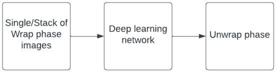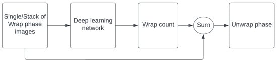 With the rise of deep learning models in many signal-processing applications [], similar trends are seen in the field of PU as well. Based on the inputs and intermediate outputs, these models can be categorized into regression methods and wrap count methods, which are described in Figure 2 and Figure 3, respectively. In the regression methods, the unwrapped phase is directly predicted from the input wrap phase by the deep learning network. The major difference in different methods proposed in the literature is the type of deep learning network trained and the loss function. Zhou et al. [] proposed a GAN network with adversarial loss which provides an output that is smooth but does not force an integer relationship between the input and output. Xu et al. [] proposed MNet, with mean absolute error (MAE) and structural similarity index measure (SSIM) [] loss, which performs well at a low concentration of speckle noise. Zhou et al. [] proposed U-Net with MAE. Qin et al. [] proposed ResUNet with MAE. An advantage of these methods is the better accuracy of the model in the presence of noise and discontinuity. The unwrap values are smooth but violate the mathematical relationship of Equation (1). Wrap count methods predict the wrap count (k) from Equation (1). This translates the problem into a classification or segmentation task. Liu et al. [] were the first to propose this idea. Spoorthly et al. [] proposed the use of Dense-UNet for wrap count estimation with MAE and cross-entropy and residue loss as the loss function, which performs well with noisy data, but their method is only validated against a custom simulation dataset. Zhang et al. [] employed EESANET, with weighted cross-entropy as the loss function. The advantages of wrap count methods are the simple network structure and short training time, but the performance of the PU is bad in the presence of noise and discontinuity. Perera et al. [] proposed a spatial quad-directional long short-term memory (LSTM)-based model for phase unwrapping. To learn the horizontal and vertical phase relationships, four distinct spatial directional sequencings were used to train the network. The variance error loss was used as a loss function to learn multiple solutions. The proposed algorithm performed well in the presence of noise but had incorrect unwrapping boundaries. A summary of some of the important research in deep learning to solve SBPU is provided in Table 2.
