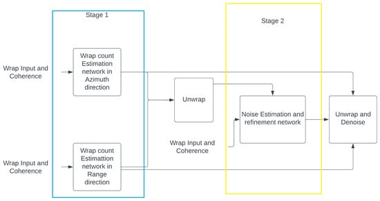 In general, deep learning segmentation-based phase estimation methods suffer from poor noise immunity [,]. Hence, these methods should be preceded by noise-filtering techniques, which affect the statistical distribution of phase and introduce additional errors in the unwrapping. A single joint phase unwrapping and denoising architecture provides better noise immunity. Hence, we are proposing a two-stage U-Net network that is capable of performing denoising and unwrapping jointly.