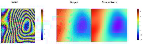 A total of 7000 interferograms were used for training, 3000 for validation, and 3000 for testing. We implemented all experiments on a computer with an Intel Xeon 4210 CPU, an NVIDIA GeForce RTX 2080 GPU, and 128 GB memory. The network was trained for 100 epochs with a batch size of 32 and the Adam optimizer, with a learning rate set to 0.001, on the Pytorch platform. The network was initialized with weights and biases for all layers using a uniform distribution from −1 to 1. No data augmentation technique was used as the dataset is sufficient to train the model.