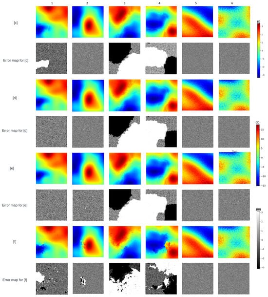 Qualitative comparison of unwrapped outputs of various traditional algorithms (starting from row 1). Each column shows one sample example and has the same wrap phase interferogram and ground truth (row 1 and row 2 respectively) as Figure 7. Rows 2, 4, 6, and 8 are the error maps for 1, 3, 5, and 7 unwrap outputs. [c], [d], [e], and [f] refer to outputs of BM3D [] + SNAPHU [], SNAPHU [], Chartrand et al. [] and, Herraez et al. [] respectively. (i), (ii) and (iii) indicate the color bar for the scale of wrap input, unwrap output, and error map respectively.