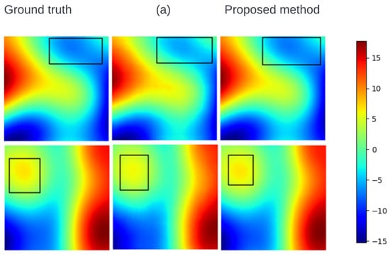 Perera et al. [] produce visually noise-free output (corroborated by a high SSIM in Table 3) but have incorrect unwrap boundaries, as shown in Figure 9 and the error map (row 8) in Figure 7. The unwrap values produced by Perera et al. [] have a higher dynamic range (also indicated by the error map), which results in a higher UFR, resulting in incorrect measurements in the InSAR process pipeline. The method of Sica et al. [] produces noisy output and a noisy error map, which indicates its poor immunity to noise.