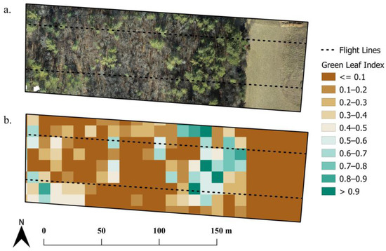 A land classification map was derived from optical red-green-blue (RGB) imagery that was collected over the study site during the same period as the lidar surveys. The imagery was collected using a DJI Phantom 4 RTK (Shenzhen, China) during leaf-off conditions. An orthomosaic of the study site was generated using Agisoft Metashape (version 1.8.4). Within the extent of forest cover in our study area, the Green Leaf Index (GLI, Equation (1); [34]) was calculated from the RGB imagery as