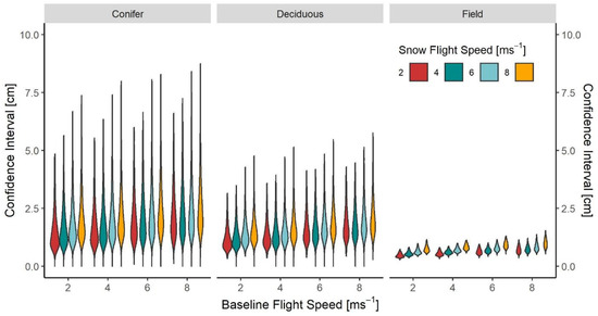 Snow depth precision was estimated using confidence intervals for all sixteen combinations of baseline and snow-on speed by land type. Across the study site, the distribution of snow depth confidence intervals for pairwise flight speed combinations had similar patterns for all land types (Figure 2). Flight speed had little impact on snow depth confidence intervals within the field, with nearly all grid cells producing snow depth confidence intervals less than 1.5 cm for all flight speed combinations. The narrowest confidence intervals were produced from flight speeds of 2 m s−1 for both surveys for all three cover types (Table 1). In general, however, there were disparities between field and forest confidence intervals of snow depth, with consistently narrower confidence intervals in the field at any flight speed combination due to higher ground return density in the field compared to the forest.