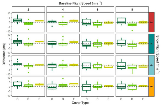 Box plots of the differences between lidar-derived snow depth and in situ snow depth for all flight speed combinations by field (F), deciduous (D), and coniferous (C) vegetation cover types. The box is framed by lower and upper quartile values with its center line indicating the median value. The box height is the interquartile range (IQR). The lower whisker extends to 1.5 times the IQR below the lower quartile or the minimum value in the dataset. The upper whisker extends to 1.5 times the IQR above the upper quartile or the maximum value in the dataset. Outliers are also shown.