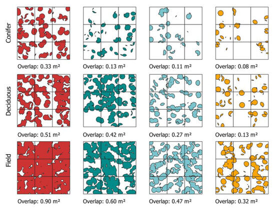 Examples of areas of overlap metrics between baseline and snow-off flights by land use. Each 1 × 1 m grid cell was divided into nine subplots. The total area of overlap was calculated for the entire grid cell. For consistency, colors used here are for snow-on flight speeds of 2 m s−1 (red), 4 m s−1 (blue), 6 m s−1 (light blue), and 8 m s−1 (gold).