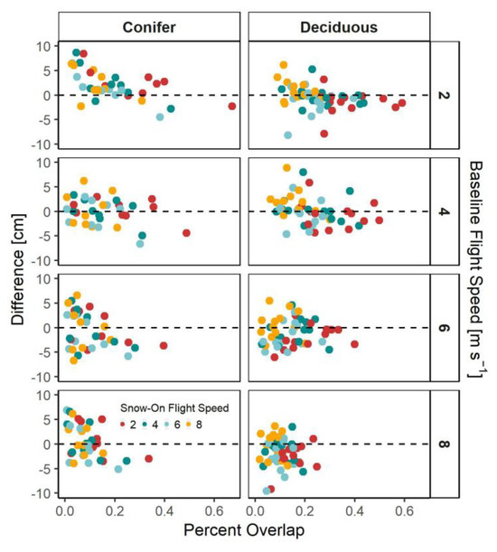 Although the overlap increased with reduced flight speeds for either survey, the minimum mean difference did not correspond with the greatest mean overlap for either cover type (refer to Figure 4). Instead, the minimum absolute mean difference corresponded with a baseline flight speed of 6 m s−1 and a snow-on flight speed of 2 m s−1 for conifer plots and a baseline flight speed of 8 m s−1 and a snow-on flight speed of 8 m s−1 for deciduous plots. However, the range of differences tightens with an increase in overlap.