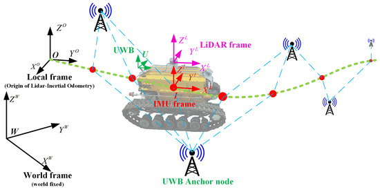Lidar-inertial odometry provide the local pose estimation between {I} and {O}, denoted by . The extrinsic parameters between IMU with the 3D lidar and the UWB mobile node, denoted by and , are known by mechanical configuration. UWB observations provide the global position constraint in {W} denoted by . There is an invariable transformation between {O} and {W} after system initialization, denoted by , which represents the extrinsic transformation between the lidar-inertial odometry coordinate system {O} and the world coordinate system {W}. Our goal is to estimate the state of IMU in {W}, which is denoted by .