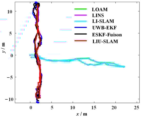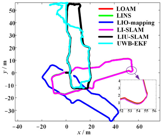 y axis direction), the UWB-KEF regains an usable positional information, but still shows a large offset when the concrete pillar is in the way (lower right corner of the curve represented by the UWB-EKF). The LIU-SLAM algorithm, in the process of fusing the UWB localization information, is set to consider the covariance or positional distance of UWB localization as unavailable. When the origin of the UWB localization system reaches a specified threshold (30 m for this experiment), the UWB localization results are considered unavailable, and at this point, the position estimation only relies on the laser inertial odometers and the available UWB distance observations, and therefore a complete and correct trajectory is obtained. The LIU-SLAM algorithm sets two thresholds when fusing UWB localization information: a covariance threshold for UWB localization and the distance threshold from the robot’s current position to the origin of the localization system (30 m for this experiment). The UWB localization results are judged to be unavailable when the threshold is exceeded. At this point, only the lidar-inertial odometry and available UWB distance observations were relied upon for position estimation, and therefore, a complete and correct trajectory was obtained. LOAM, LINS, and LI-SLAM obtained very close trajectory results but were not aligned with the UWB localization system, whose coordinate system establishment was still the one established at the robot’s starting point of motion. LIO-mapping is offset from other algorithms due to the unstable initialization process, which results in the establishment of the coordinate system starting from the robot’s position at the moment of successful initialization. A comprehensive comparison of the above algorithms shows that LIU-SLAM fuses the available global position estimation generated by UWB-EKF or the available UWB distance observation and the local pose estimation from the lidar-inertial odometry, realizing the local lidar-inertial odometry alignment to the UWB positioning system’s coordinate system while obtaining a smooth, complete, and accurate trajectory with a higher accuracy.