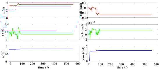 Figure 11, the extrinsic parameter in the directions of the x, y, and z axis converges rapidly from the initial state of 0 to the estimated values around 3.489, 0.141, and 0.802 during the coordinate system alignment process, which corresponds to step b (