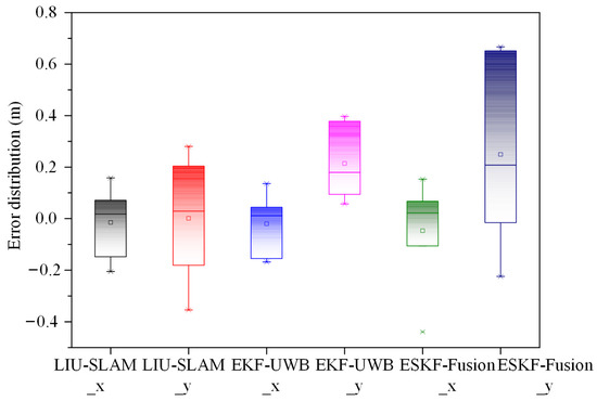 Table 6, it can be seen that the LIU-SLAM method has the highest localization accuracy, with a mean value of 10.3 cm in the x direction and 20.2 cm in the y direction, which is slightly higher than that of the EKF-UWB method, and significantly better than that of the ESKF-fusion method in the x and y directions.